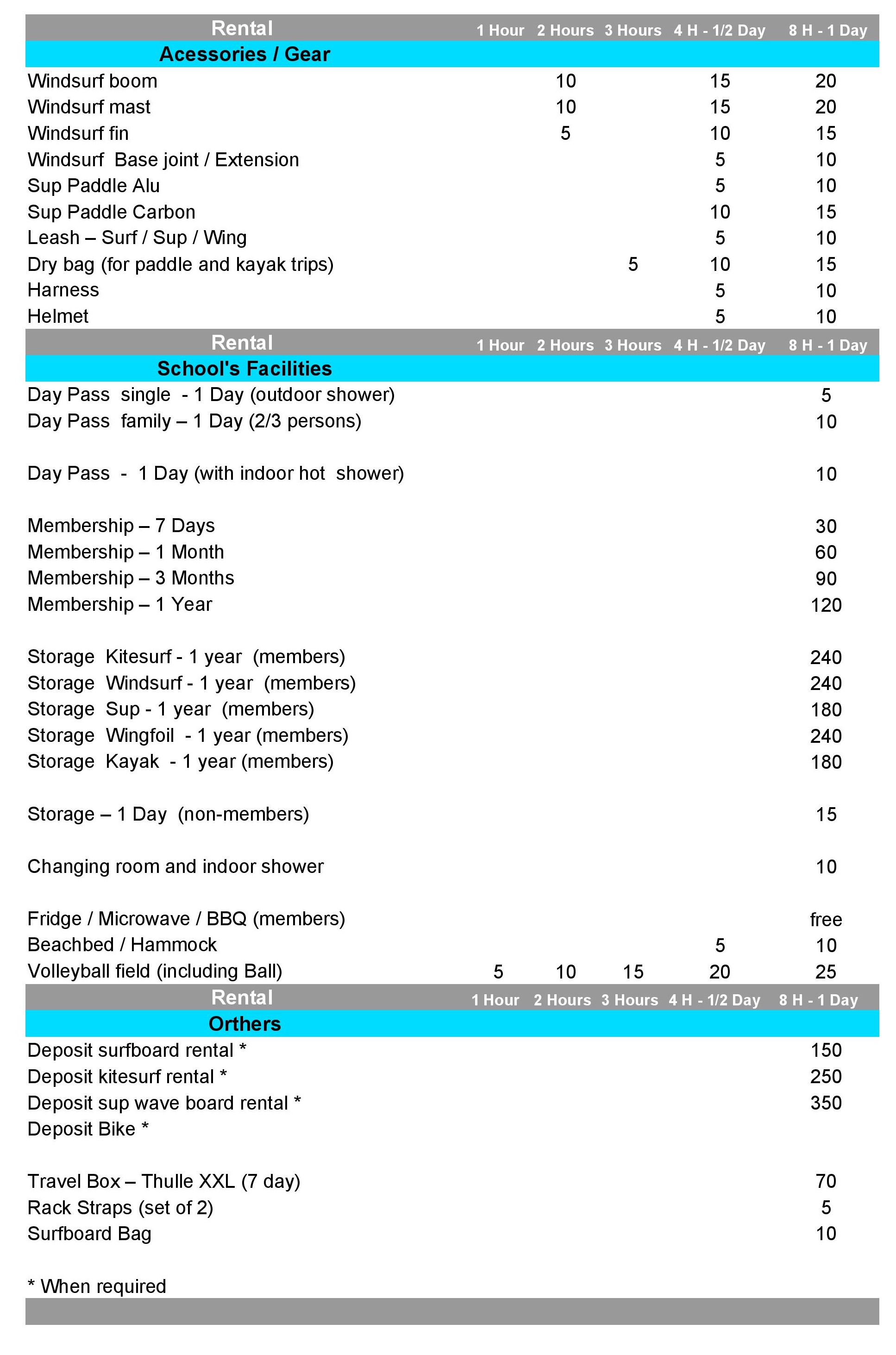 - O pagamento é feito antecipadamente pela totalidade, e além de um documento de identificação poderá ser exigida uma caução minima, normalmente não inferior a 150 euros/prancha.