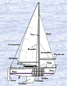 - Mastro: Perfil vertical que suporta as velas e a retranca Mestra ou Vela Grande: Vela principal montada no mastro maior Moitões: Conjunto de roldanas que servem para guiar cabos numa direção desejada ou para compor conjuntos para a redução de esforço